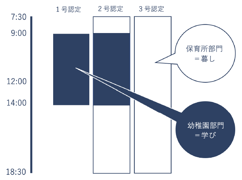 …幼稚園に入園した3・4・5歳児で1号認定を受けた後、お仕事などの都合で長時間の保育が帯で必要となった方は、市役所に申請をすることで2号認定もしくは近しい認定が受けられる制度もございます。